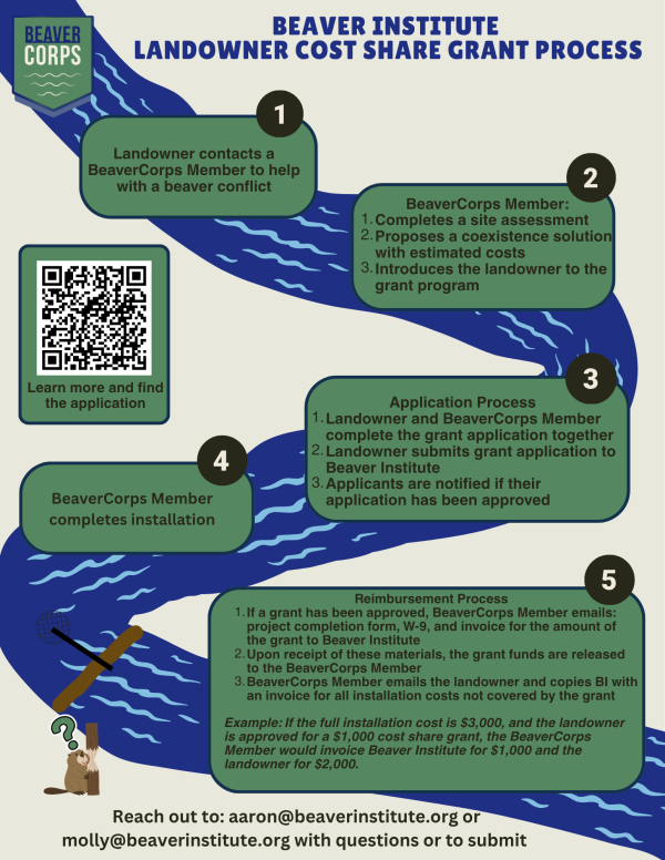 Example: If the full installation cost is $3,000, and the landowner is approved for a $1,000 cost share grant, the BeaverCorps Member would invoice Beaver Institute for $1,000 and the landowner for $2,000.